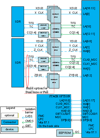 An optional bottom-side FMC stacking connector routes the Lower LA[16:0] signals from the stack connector to the LA[33:17] of the top FMC connector.